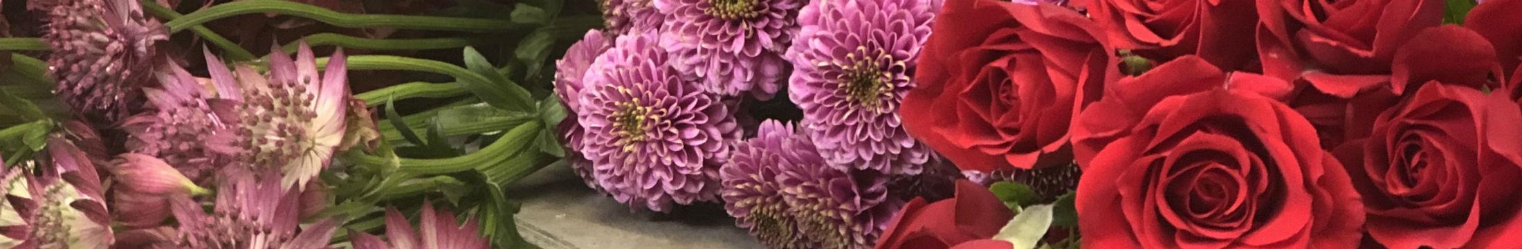 En lav tætbundet buket af sæsonens blomster